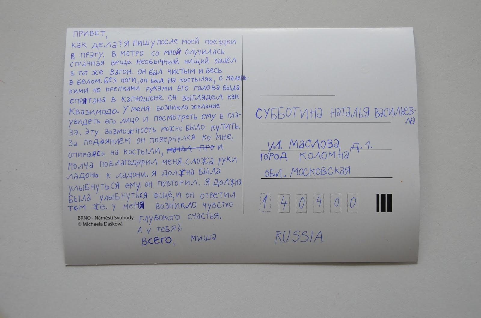 I wrote postcards for unknown citizens of Kolomna of which I gained addresses. In the greetings I was telling some short strange stories about what happened to me here but I situated them to the Czech Republic. I subscribed the postcards as Misha, I apprehensive the fact that it is the name for russian boys. First I sent the postcards to my friend in Czech and then she resent them separately back with stamps for Russia.